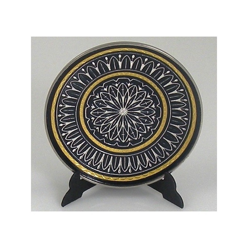 Beautiful decorative display plate with handmade gold and silver damascene design work featuring a geometric design. This plate is round in shape and measures 4.5 cm in diameter. Plate comes with a display stand at no extra cost.