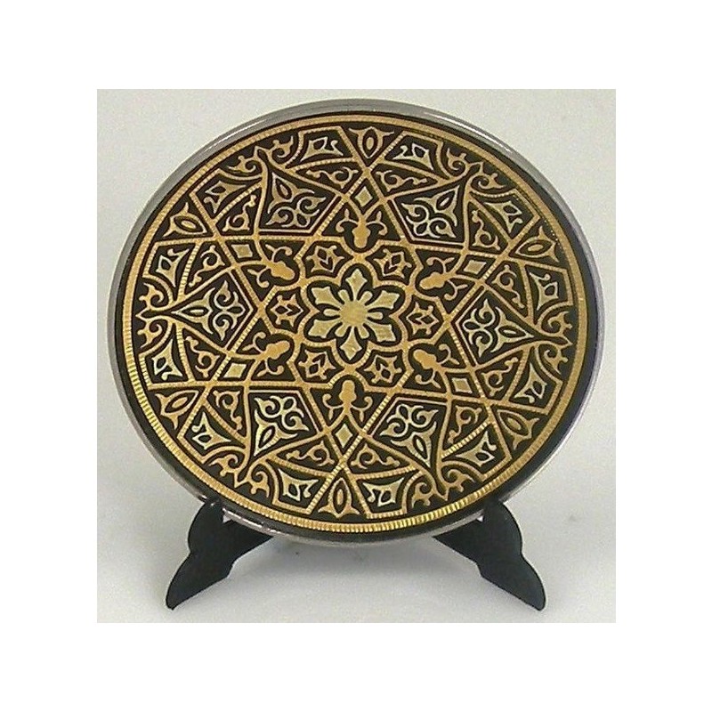 Beautiful decorative display plate with handmade gold damascene design work featuring a geometric design. This plate is round in shape and measures 4.5 cm in diameter. Plate comes with a display stand at no extra cost.