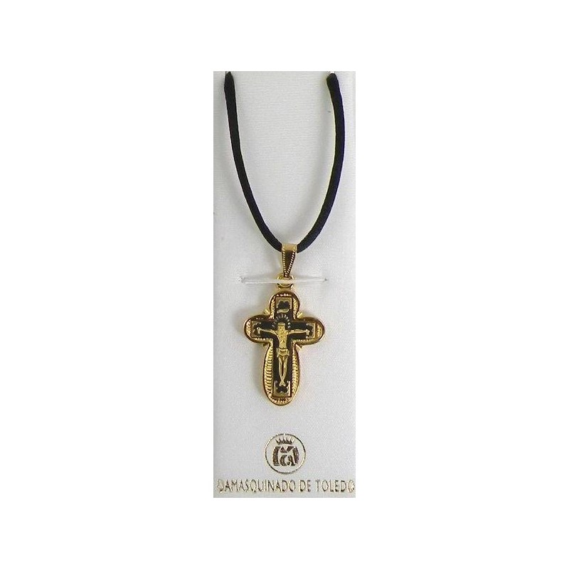 Damascene Gold Cross Jesus Pendant on Black Cord Necklace by Midas of Toledo Spain style 8237