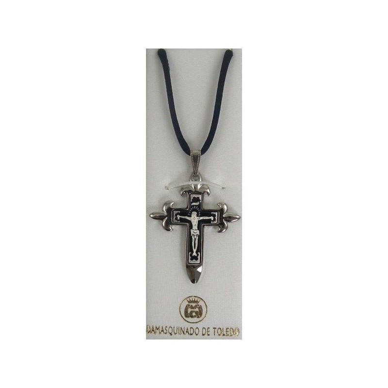 Damascene Silver Cross Jesus Pendant on Navy Cord Necklace by Midas of Toledo Spain style 9235