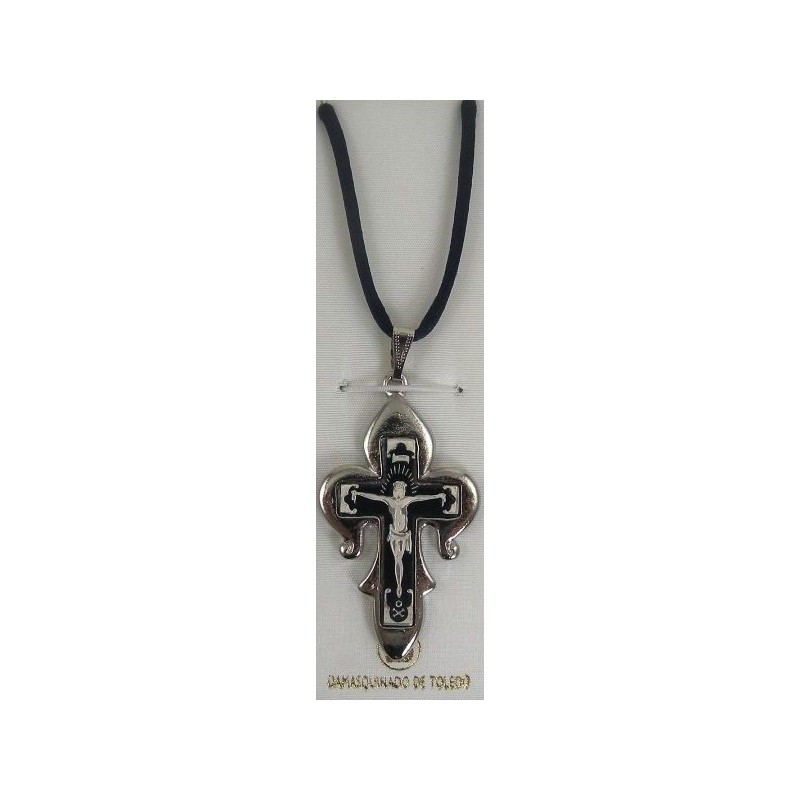 Damascene Silver Cross Jesus Pendant on Navy Cord Necklace by Midas of Toledo Spain style 9233